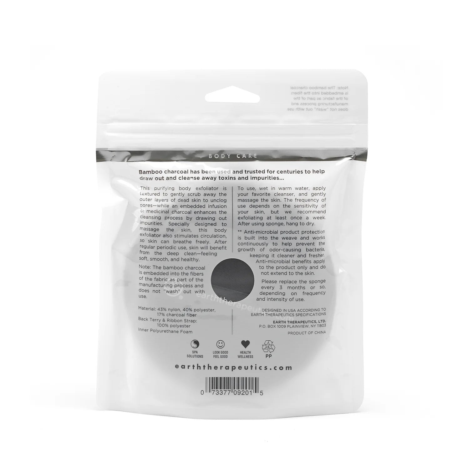 This Purifying Exfoliating Sponge is textured to gently scrub away the outer layers of dead skin to unclog pores while an embedded infusion of medicinal Bamboo Charcoal enhances the cleansing process by drawing out impurities. Also massages and stimulates circulation, so skin can breathe freely.
