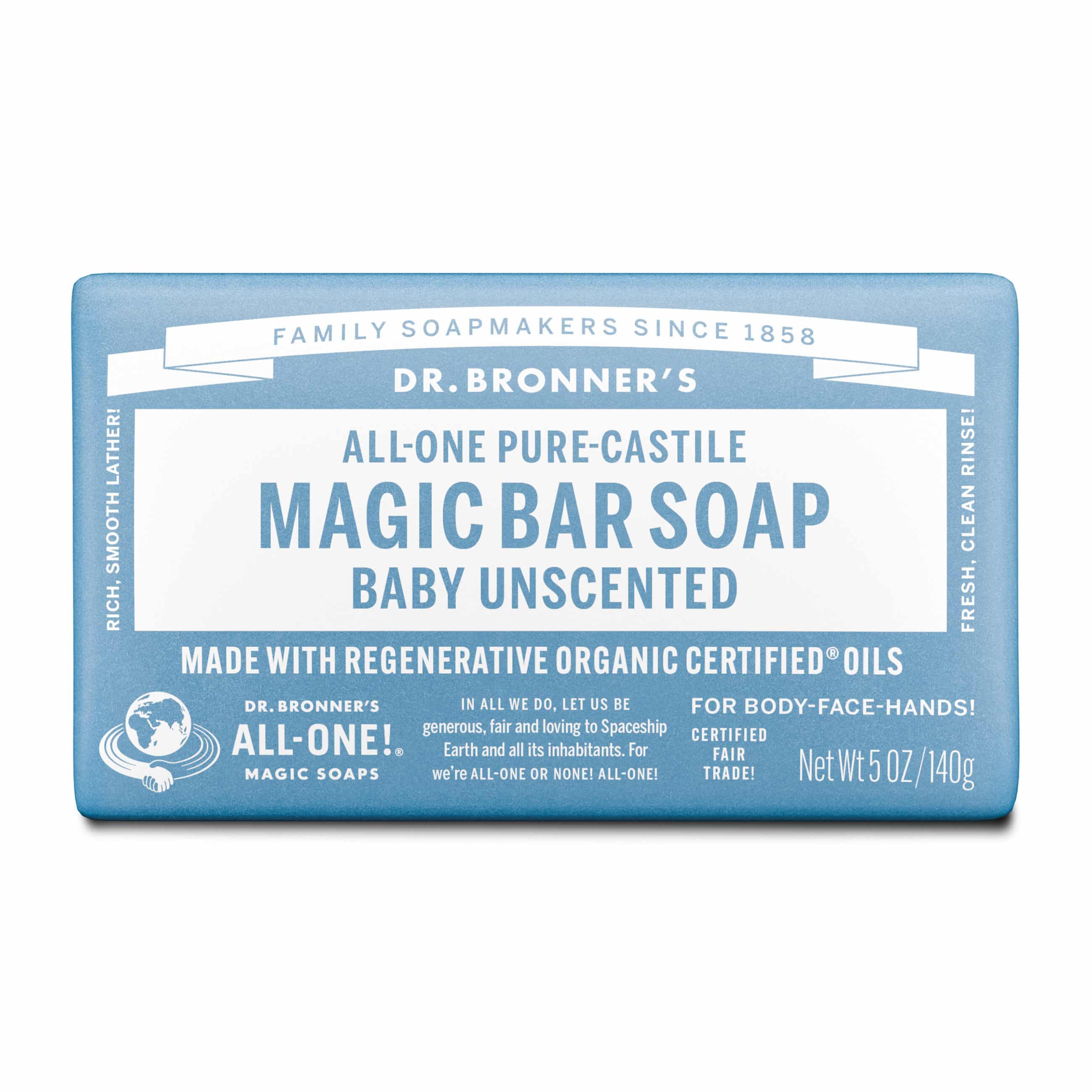 With no added fragrance and double the olive oil, our Baby Unscented Pure-Castile Bar Soap is good for sensitive skin – babies too (though not tear-free!). Dr. Bronner’s Bar Soap is made with certified fair trade ingredients and organic hemp oil for a soft, smooth lather that won’t dry your skin. 100% biodegradable in a 100% post-consumer recycled wrapper.