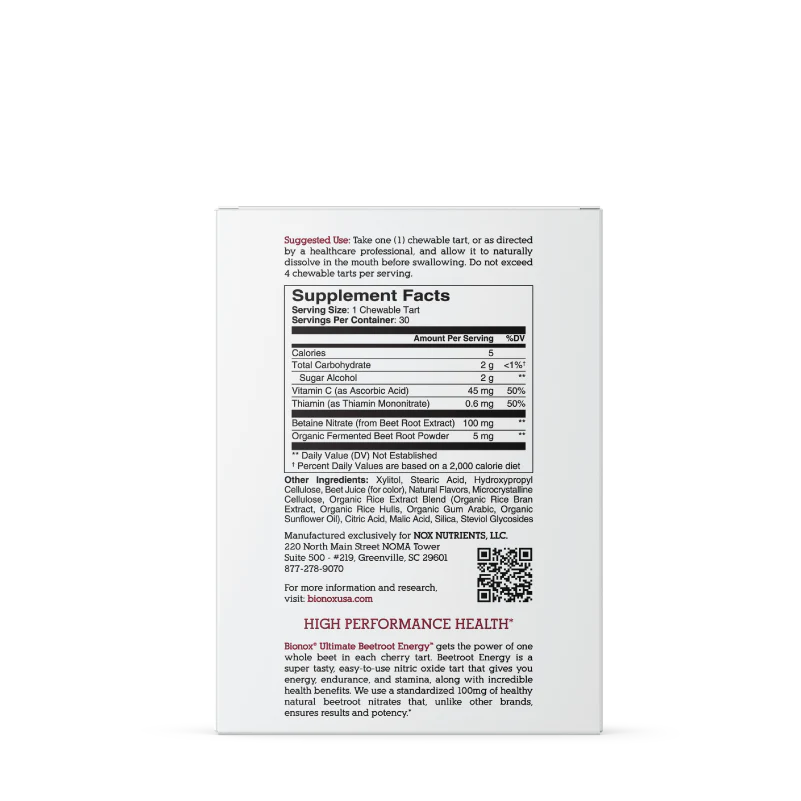Beetroot Energy offers the benefits associated with natural beetroot nitrates in a format that’s enjoyable and convenient. Each cherry tart contains the equivalent of one whole beet, providing a smooth and easy-to-use supplement that helps support nitric oxide production for energy, endurance, and vitality. Unlike other beetroot products that may have an earthy taste, Beetroot Energy features a naturally sweet and refreshing cherry flavor, making it a pleasure to take every time.