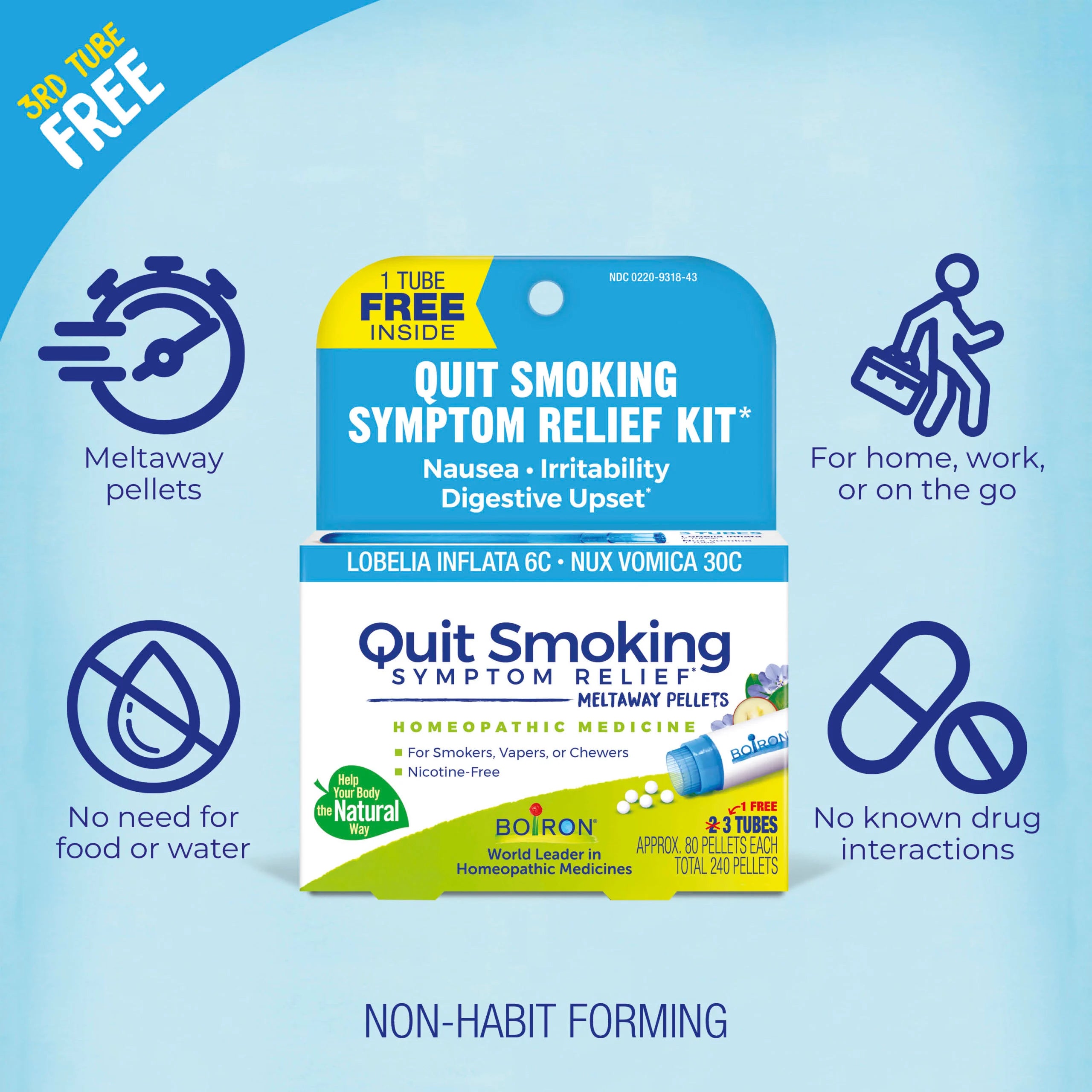 The Quit Smoking Symptom Relief Kit by Boiron provides a healthy, plant-powered solution to manage symptoms during the quitting process. It includes two tubes of Lobelia inflata 6C for nausea, and one tube of Nux vomica 30C for irritability and digestive upset commonly associated with nicotine withdrawal.* Convenient and discreet, the meltaway pellets dissolve under the tongue without water and come in portable tubes that are easy to take on the go.