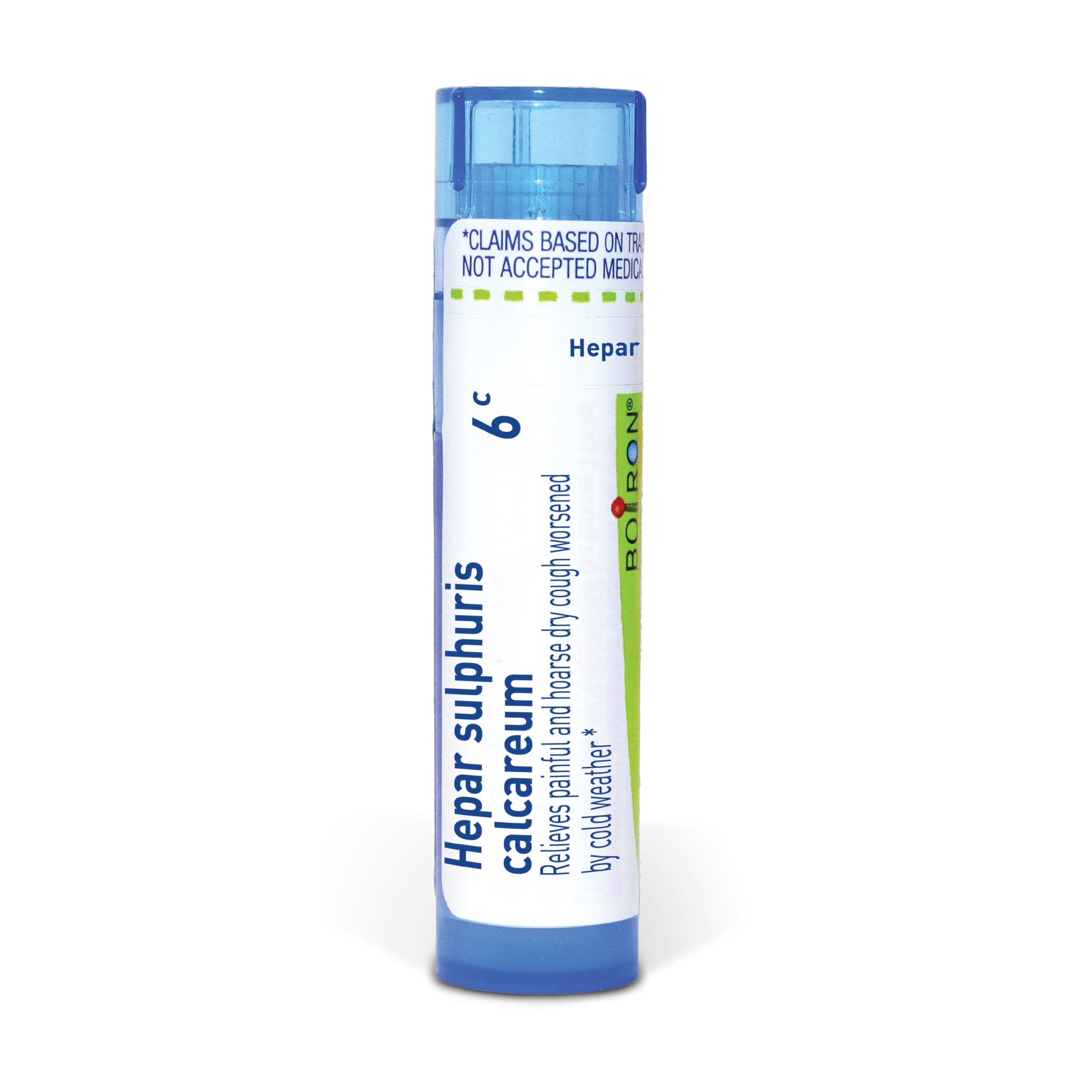 Customize your care with Boiron single medicines for highly targeted relief. Hepar Sulphuris Calcareum is a homeopathic medicine that relieves painful and hoarse dry cough worsened by cold weather.* The pellets melt in your mouth and can be taken on the go, no food or water needed.