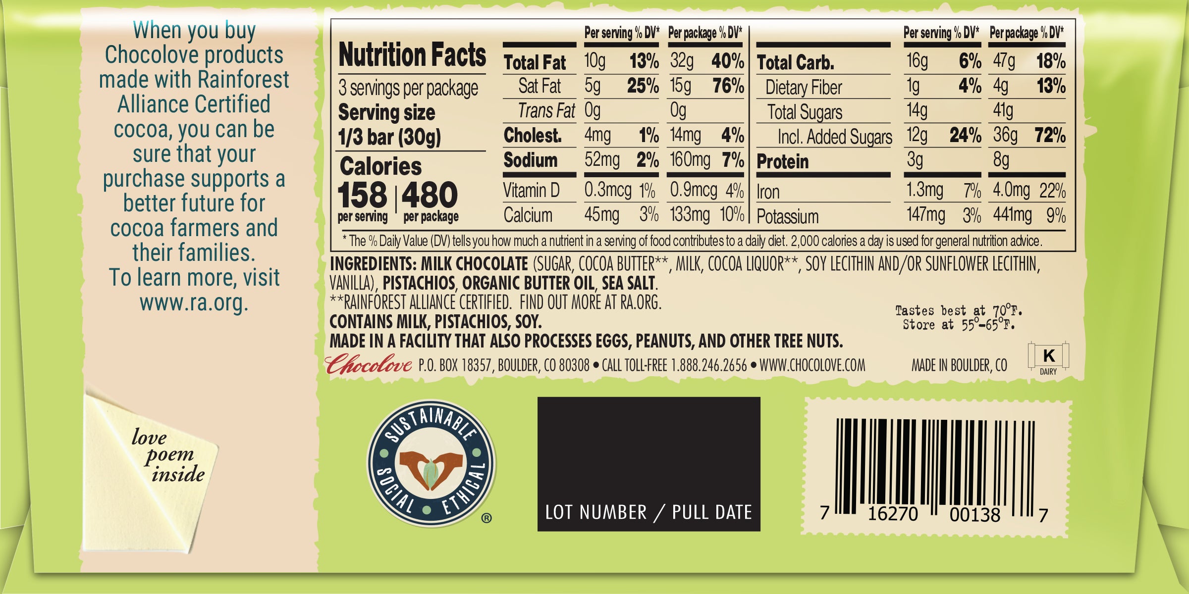 Chocolove Pistachios & Sea Salt in Milk Chocolate 3.2oz