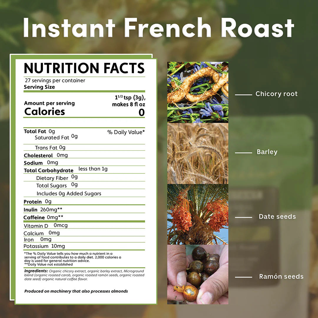 Intense deep coffee notes with a robust focused body from roasted chicory, wild ramón seeds, and black barley – now instant!