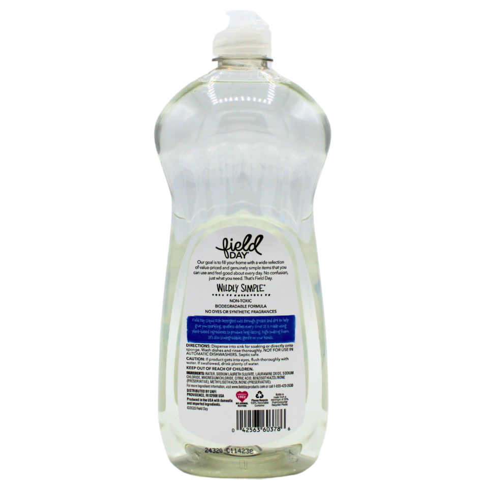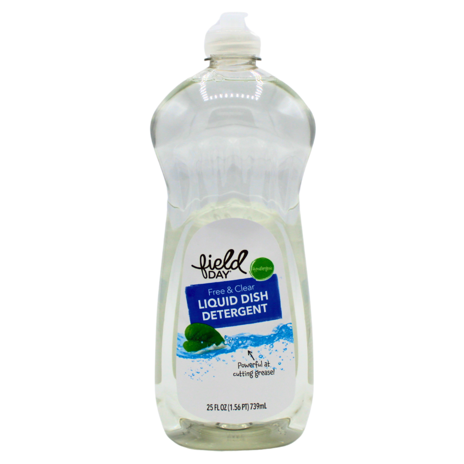 Free & Clear Liquid Dish Detergent is non-toxic, hypoallergenic but is still tough at cutting grease! Our biodegradable, high sudsing foam formula is made with plant based ingredients and contains no dyes, synthetic fragrances, or phosphates. It's tough on messes so your dishes can stay fresh and clean! All Field Day household cleaning products are cruelty free (no animal testing).