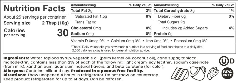 Ingredients: Water, tapioca syrup, vegetable oil (palm kernel oil, coconut oil), cane sugar, tapioca maltodextrin, contains less than 2% of each of the following: light cream, soy lecithin, sodium caseinate (from milk), xanthan gum, guar gum, natural flavors, and beta carotene (for color).