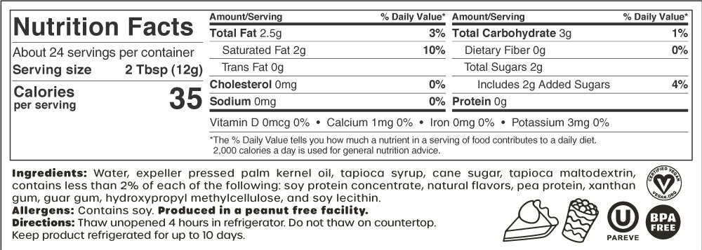 Ingredients: Water, expeller pressed palm kernel oil, tapioca syrup, cane sugar, tapioca maltodextrin, contains less than 2% of each of the following: soy protein concentrate, natural flavors, pea protein, xanthan gum, guar gum, hydroxypropyl methylcellulose, and soy lecithin.