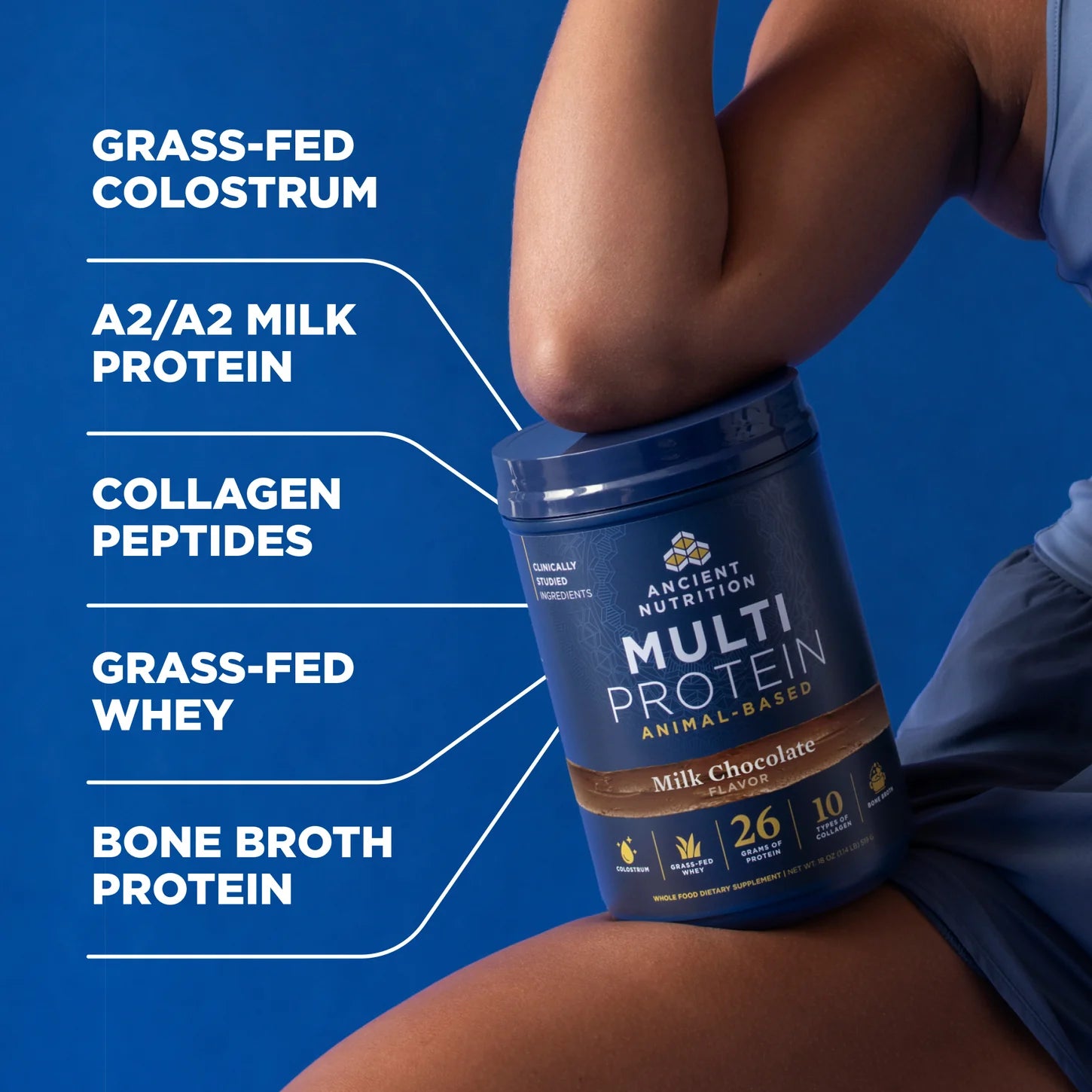 This all-in-one formula delivers 26g of complete protein from grass-fed whey, bone broth, A2/A2 milk protein and collagen peptides, as well as colostrum, probiotics and digestive enzymes. It's a performance blend to support your muscles, joints, post-workout recovery and gut health.