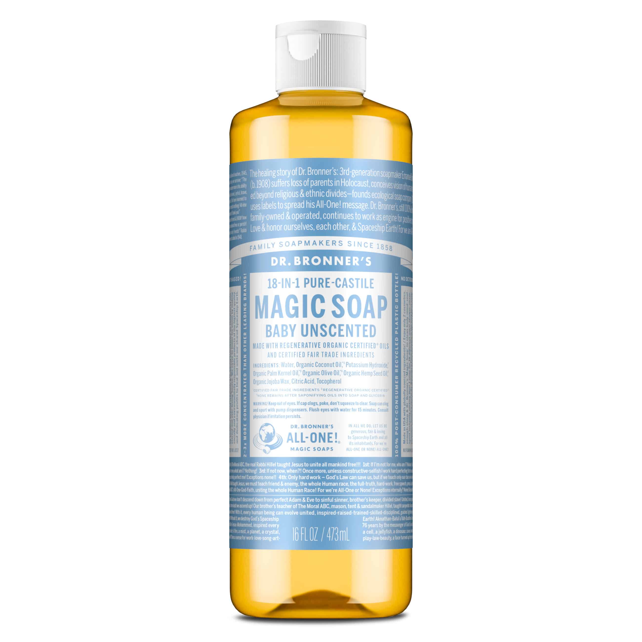 With no added fragrance and double the olive oil, our Baby Unscented Pure-Castile Liquid Soap is good for sensitive skin – babies too (though not tear-free!). Dr. Bronner’s soap is concentrated, biodegradable, versatile and effective. Made with organic and certified fair trade ingredients, packaged in a 100% post-consumer recycled bottle. All-One!