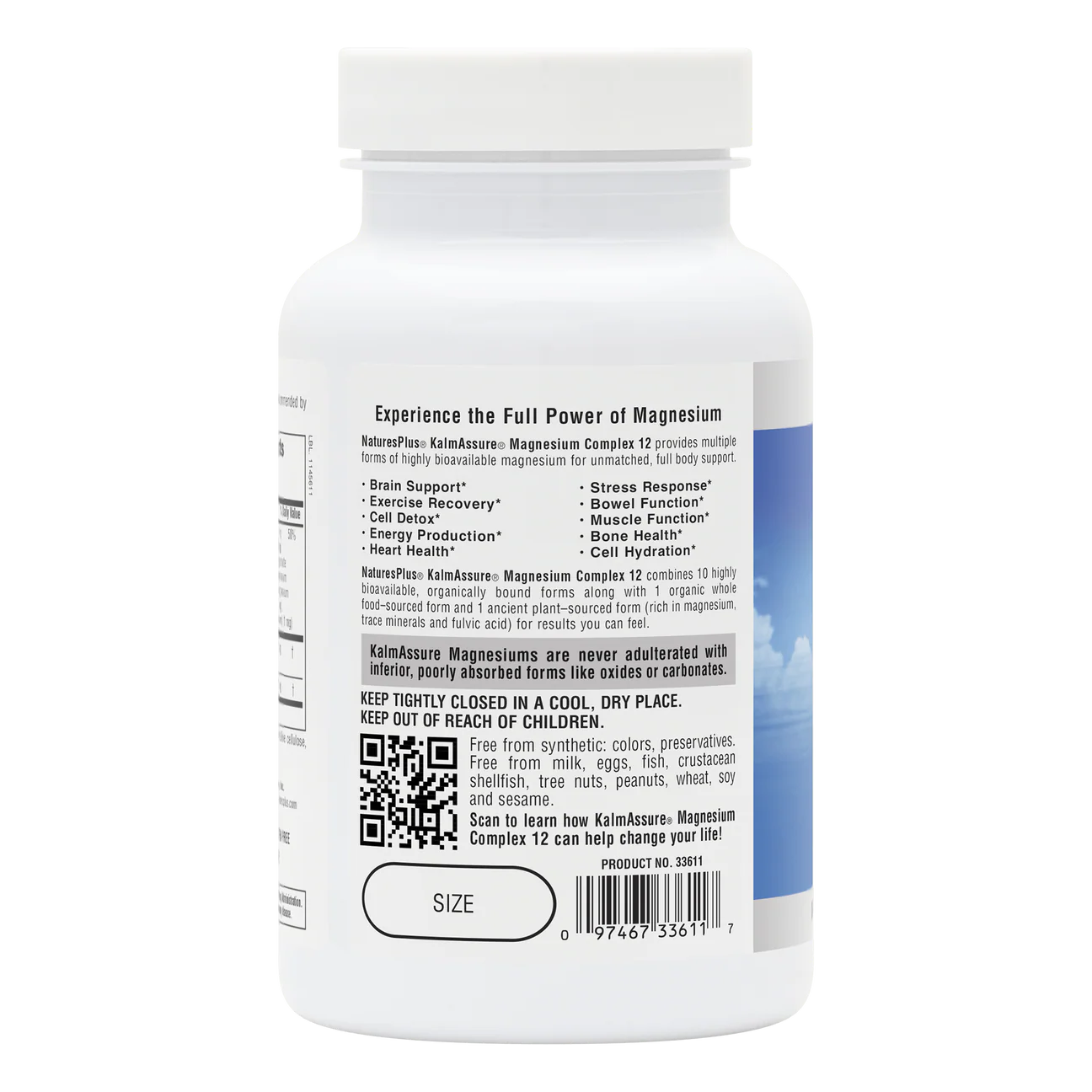 KalmAssure Magnesium Complex 12 caps deliver unmatched support with a unique formula that combines 10 organically bound forms of of highly bioavailable magnesium plus 2 whole food sources rich in magnesium and trace minerals.