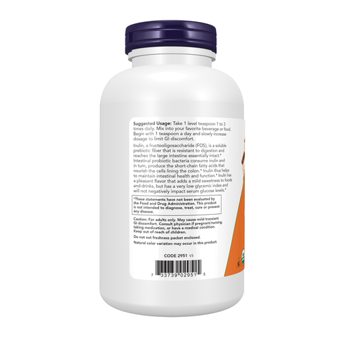 Inulin, a fructooligosaccharide (FOS), is a soluble prebiotic fiber that is resistant to digestion and reaches the large intestine essentially intact.* Intestinal probiotic bacteria consume inulin and in turn, produce the short-chain fatty acids that nourish the cells lining the colon.* Inulin thus helps to maintain intestinal health and function. Inulin has a pleasant flavor that adds a mild sweetness to foods and drinks, but has a very low glycemic index and will not negatively impact serum glucose levels.