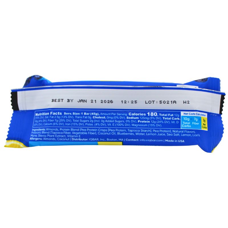 Almonds, Protein Blend (Pea Protein Crisps [Pea Protein, Tapioca Starch], Pea Protein), Natural Flavors, Prebiotic Blend (Tapioca Fiber, Vegetable Fiber), Coconut Oil, Blueberries, Water, Lemon Juice, Sea Salt, Lemon, Lion's Mane, Stevia Plant Extract, Vitamin E
