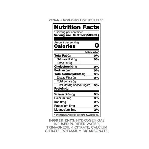 Ingredients: Hydrogen Gas infused purified water, trimagnesium citrate, calcium citrate, potassium bicarbonate.