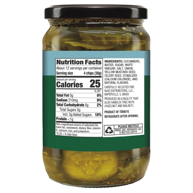 Ingredients: Cucumbers, Water, Sugar, White Vinegar, Salt, Onion, Yellow Mustard Seed, Celery Seed, Stabilizer (Calcium Chloride), And Natural Flavors.