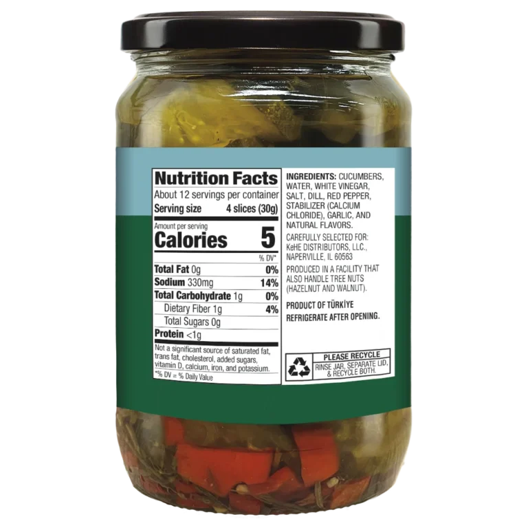 Ingredients: Cucumbers, Water, White Vinegar, Salt, Dill, Red Pepper, Stabilizer (Calcium Chloride), Garlic, Natural Flavors.