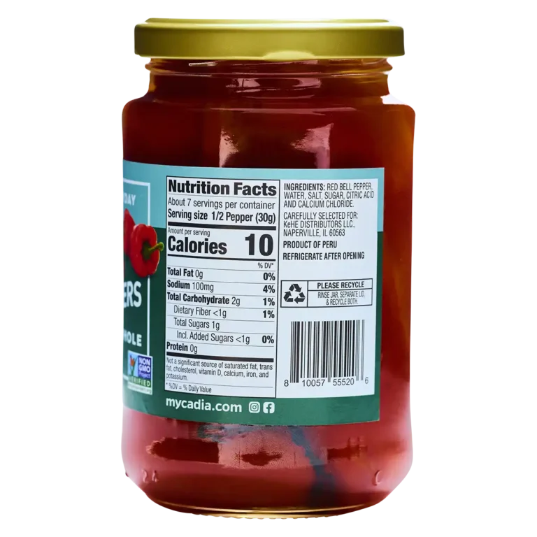 Ingredients: Red Bell Pepper, Water, Salt, Sugar, Citric Acid, and Calcium Chloride.