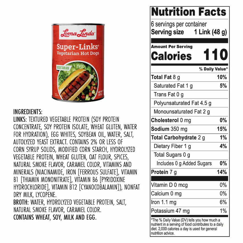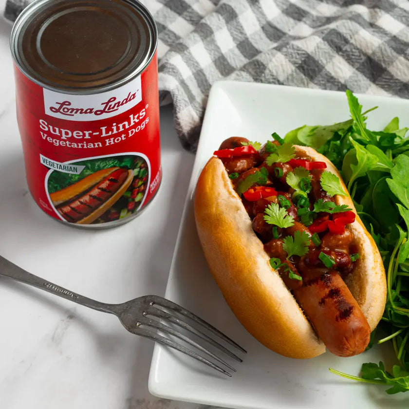 Super-Links are a delicious and hearty plant-based alternative to traditional hot dogs, made with a blend of vegetable and grain proteins. Packed with protein and containing 40% less fat than beef hot dogs, they are perfect for vegans, vegetarians, and anyone looking for a healthier option. Whether you're grilling for a group or cooking up a quick meal, Super-Links are versatile and easy to prepare, offering great taste and texture without the cholesterol or trans fats found in meat-based options. Just heat, serve, and enjoy!
