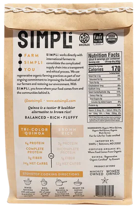 Fluffy white quinoa—check. Nutty red quinoa—check. Earthy black quinoa—check. Discover the trifecta of our award-winning SIMPLi Regenerative Organic Certified® Tri-Color Quinoa. This striking multicolor blend is naturally gluten-free, high-protein, and high-fiber, as well as flexing effortlessly between savory and sweet recipes.