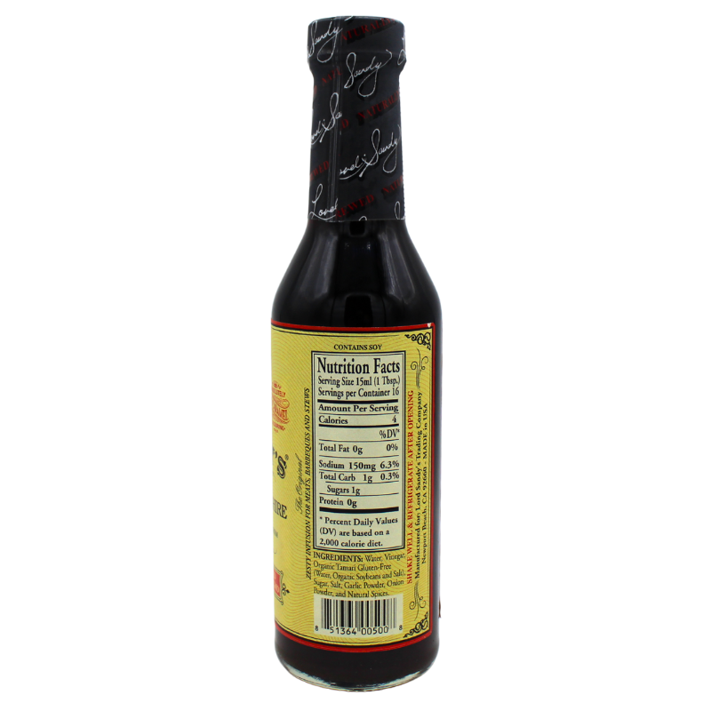 Ingredients: Water, vinegar, organic tamari gluten-free (water, organic soybeans and salt), sugar, salt, garlic powder, onion powder, and natural spices.