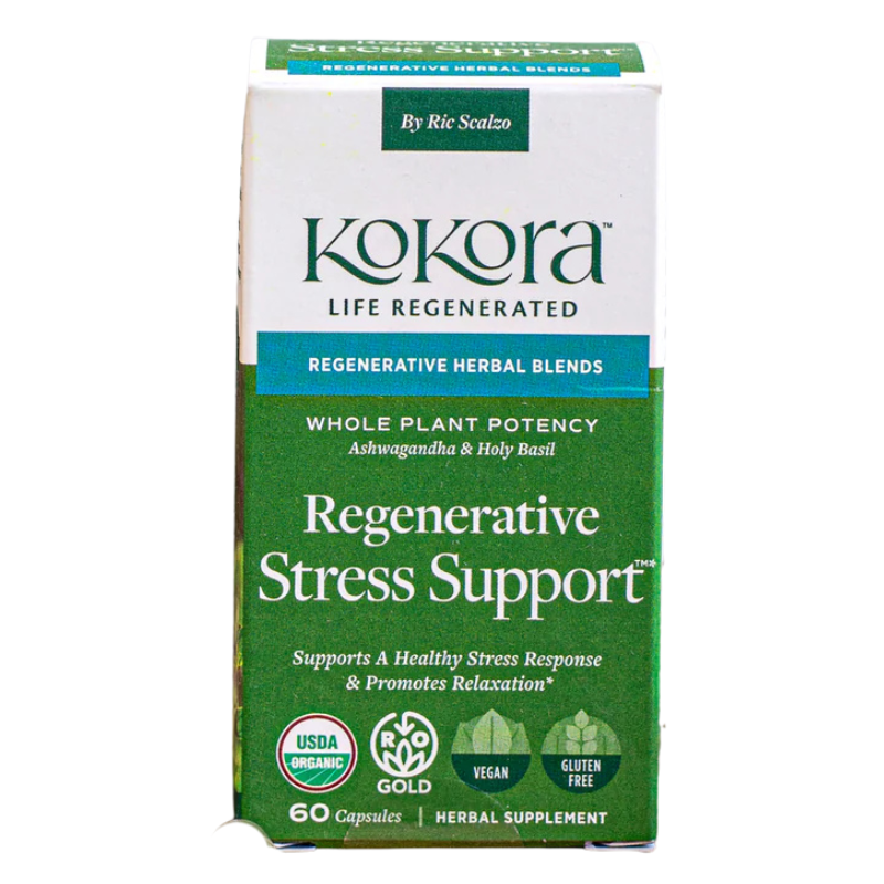 Both daytime and nighttime forms of stress can impact overall well-being, making a balanced approach to support relaxation and recovery throughout the day essential. Kokora’s Regenerative Stress formula is thoughtfully crafted to help the body adapt to daily stressors while staying grounded and clear.* Featuring Regenerative Organic Certified® Holy Basil and Ashwagandha Root, along with Bacopa and Chinese Skullcap Leaf, this calming blend of adaptogens and nootropic herbs supports a balanced mood, mental clarity, and emotional resilience.*