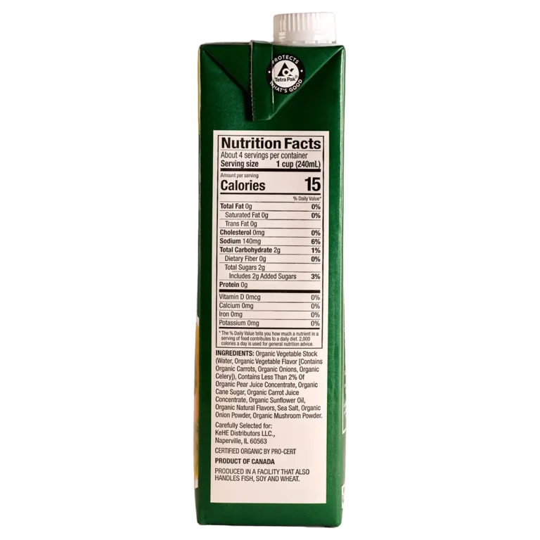 Ingredients: Organic Vegetable Stock (Water, Organic Vegetable Flavor [Contains Organic Carrots, Organic Onions, Organic Celery]), Contains Less Than 2% Of Organic Pear Juice Concentrate, Organic Cane Sugar, Organic Carrot Juice Concentrate, Organic Sunflower Oil, Organic Natural Flavors, Sea Salt, Organic Onion Powder, Organic Mushroom Powder.