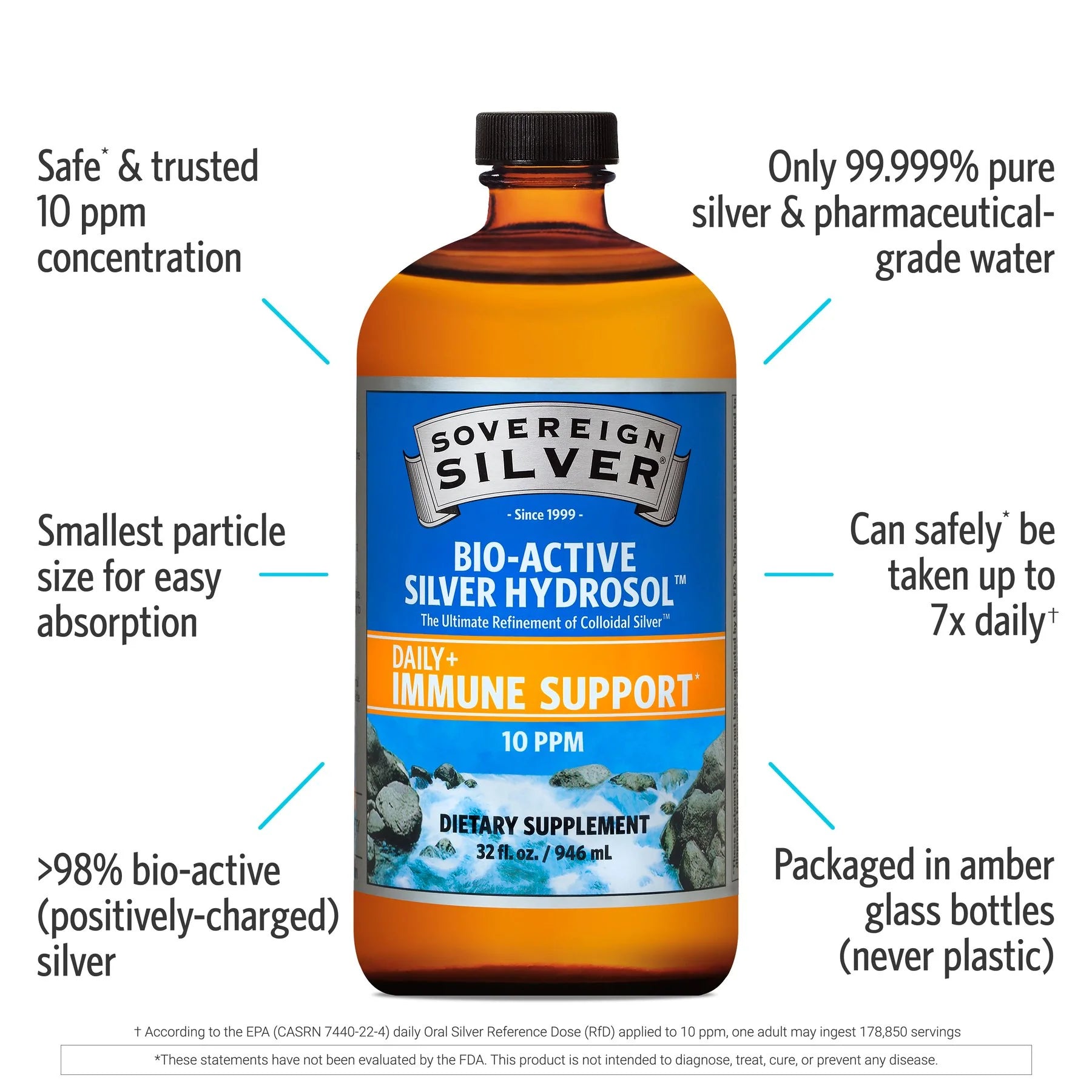 BE SAFE When it comes to concentration, more is not always better. Our tiny particle size yields greater surface area and higher efficiency, making our 10 ppm (parts per million) product more effective than competing brands containing up to 500 ppm. Taken 7 times a day for 70 years, Sovereign Silver still falls below the EPA’s daily oral Reference Dose (RfD) for silver.