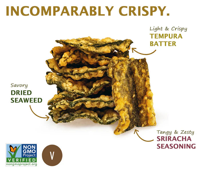Beloved, fan-favorite Tempura Seaweed Chips are just the perfect, anytime snack to satisfy your every craving! Woodridge Snacks' Tempura Seaweed chips start with sheets of sustainably sourced, savory seaweed harvested from the cool waters of the Pacific. They are then lightly battered and gently fried using the traditional Japanese tempura frying method popularized first in Nagasaki then Tokyo. Each chip exhibits a distinct, delicate crunch, far crispier than any other seaweed-based snack on the market. Our Sriracha flavor perfectly balances the mild heat of red chili peppers with the tanginess and sweetness of vinegar, garlic, and sugar for a mouth watering flavor that makes the Asian hot sauce a perennial favorite.