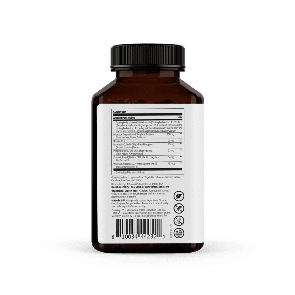 • Supports digestion and absorption with probiotics and enzymes, plus includes a 7-mushroom blend and vitamin K2 for immune, bone, and blood support.*estrogen metabolism and clear complexion*